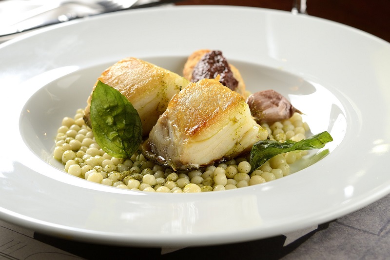 Bacalhau assado, couscous gigante, tapenade de azeitonas pretas, emulsão de azeite e ervas frescas