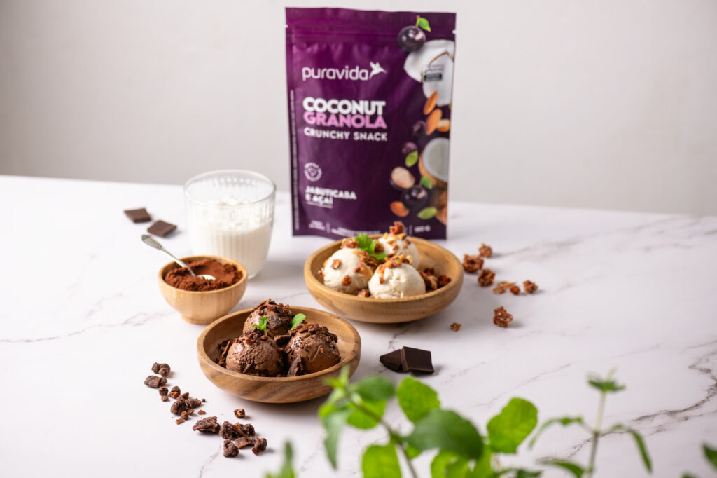 Esta sobremesa é perfeita para quem procura por algo refrescante e saboroso. A Puravida ensina como fazer sorvete de chocolate ou de banana com uma dose de proteína e a crocância das granolas.