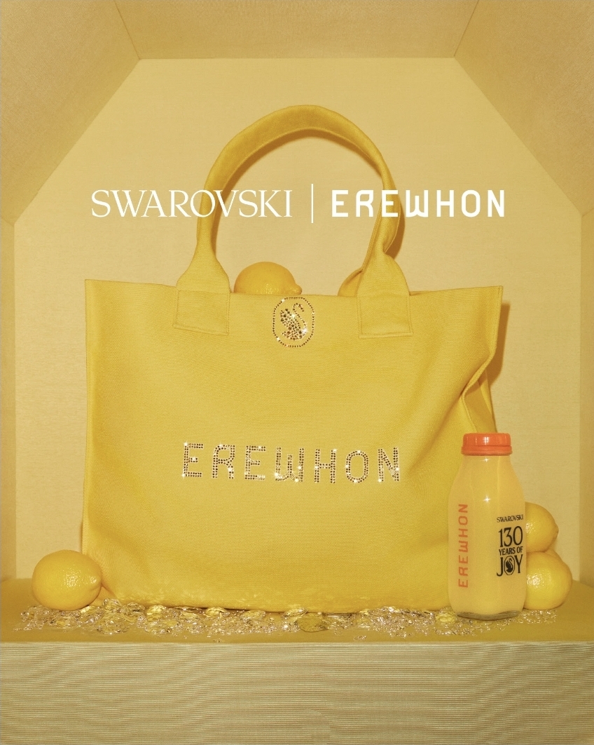 Para complementar o suco, a diretora criativa global da Swarovski, Giovanna Engelbert, também desenvolveu uma bolsa tote exclusiva cravejada de cristais. Primeira bolsa da Erewhon a apresentar esse tipo de aplicação, o modelo oversized é prático e sofisticado, confeccionado em algodão amarelo vibrante e decorado com os logotipos cristalizados da Erewhon e da Swarovski na parte frontal e traseira, além do logotipo comemorativo de 130 anos da Swarovski no bolso interno. Apenas 300 unidades estarão disponíveis para compra, cada uma numerada individualmente, reforçando seu caráter de item de coleção.